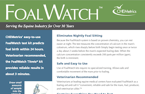 Please click on the links below to download the FoalWatch test kit documentation in PDF format, including the step-by-step Test Procedure, the Safety Data Sheet (a.k.a. Material Safety Data Sheet or MSDS) and the summary brochure. Please note, the SDS file comprises of two SDSes, one for the reagent ampoules and the second for the indicator solution bottle.